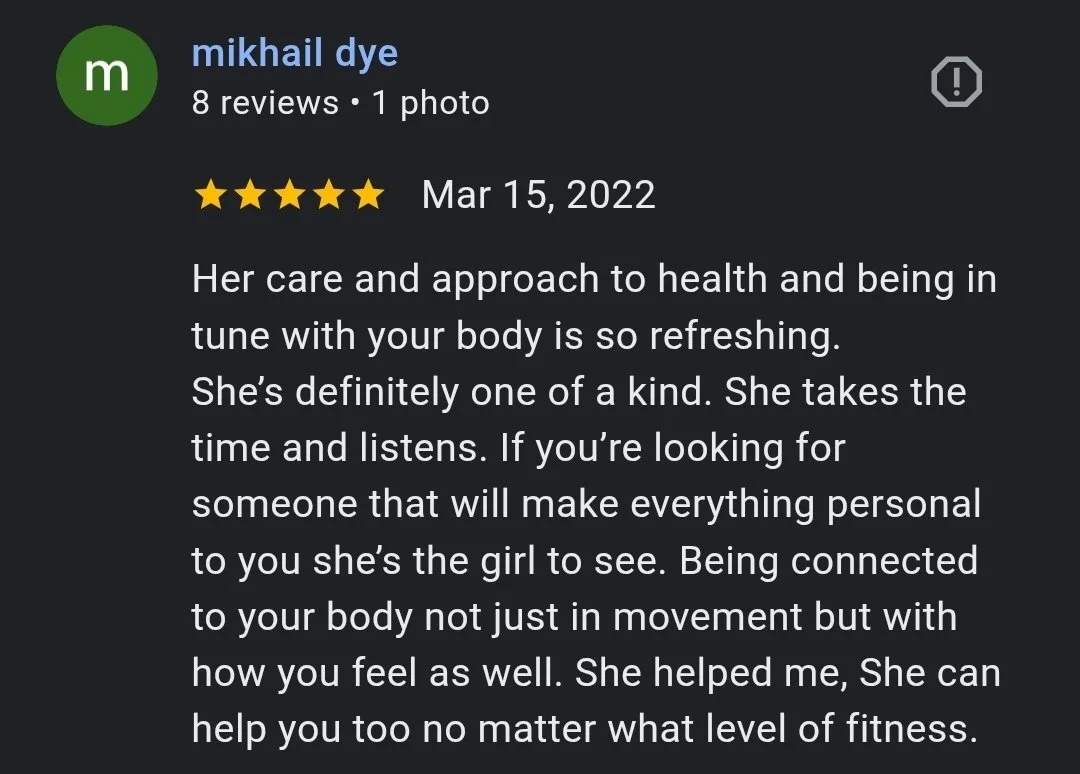 Ya can read transformational stories from my clients here! In a nutshell, I’m a total nerd when it comes to biomechanics, and I’m obsessed with helping people live from their healthiest h’om’e.